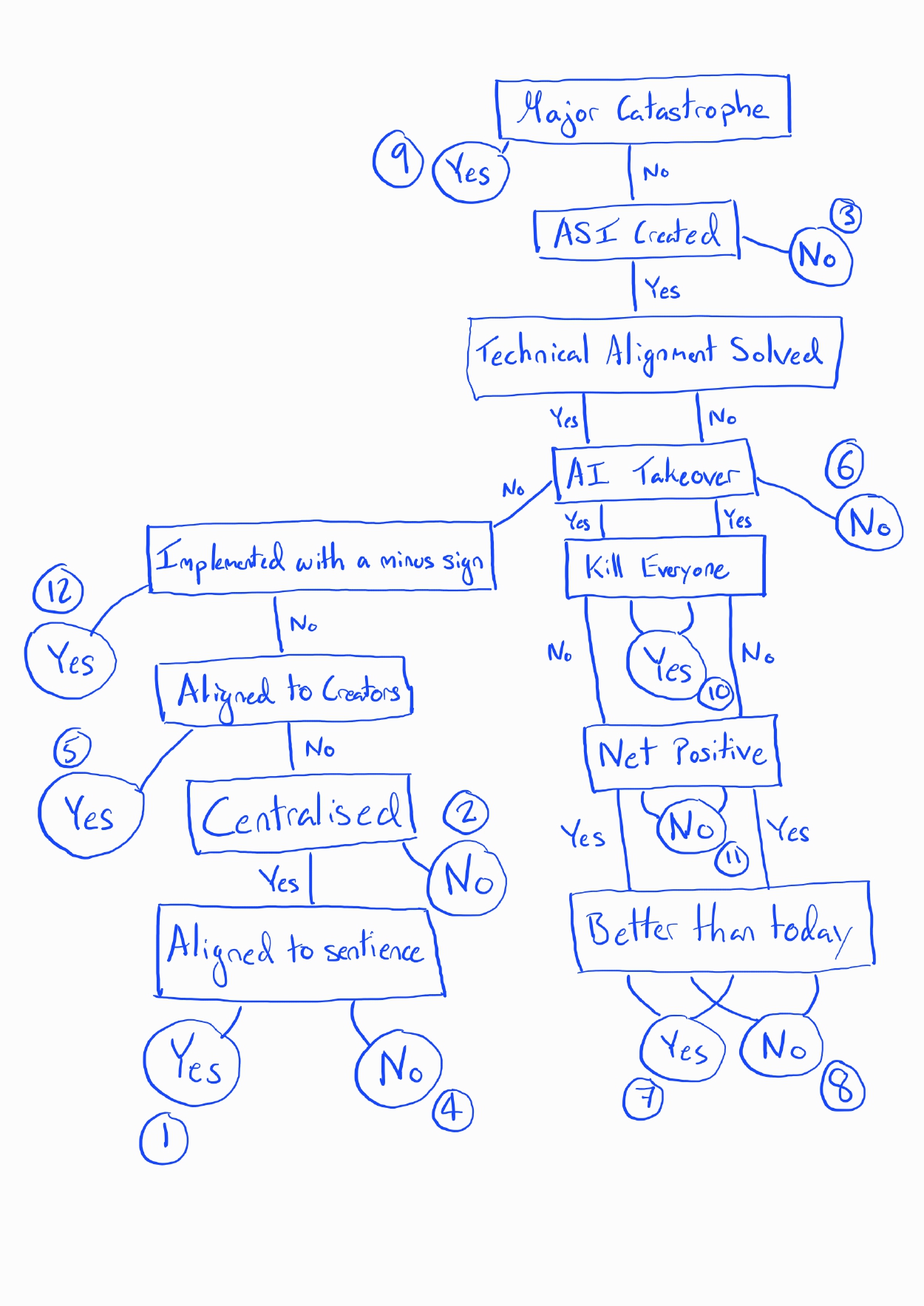 Next to the end nodes of the graph, I have labelled the outcomes according to my personal preference for the broad categories (remember, the categories will likely overlap, with some worlds within them being better than others).